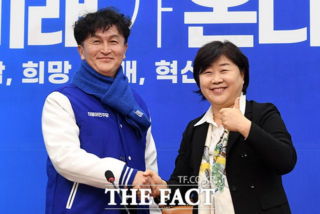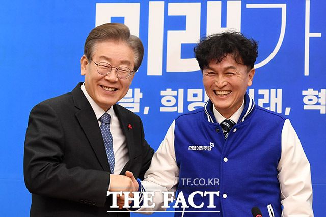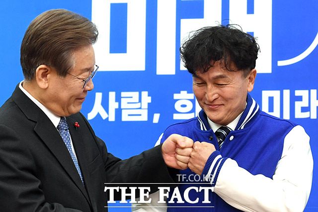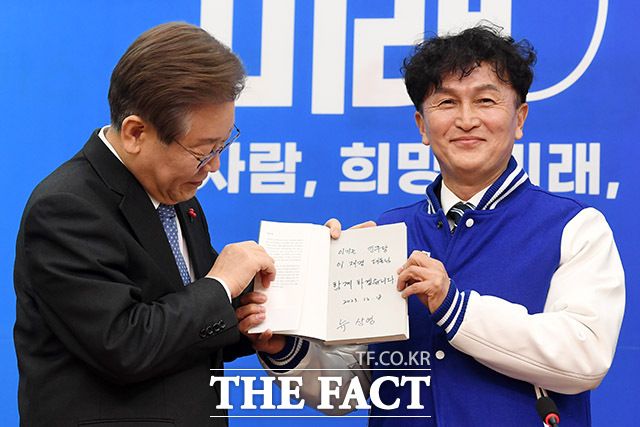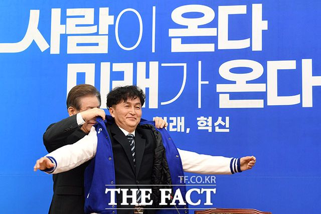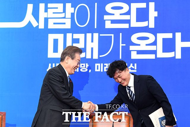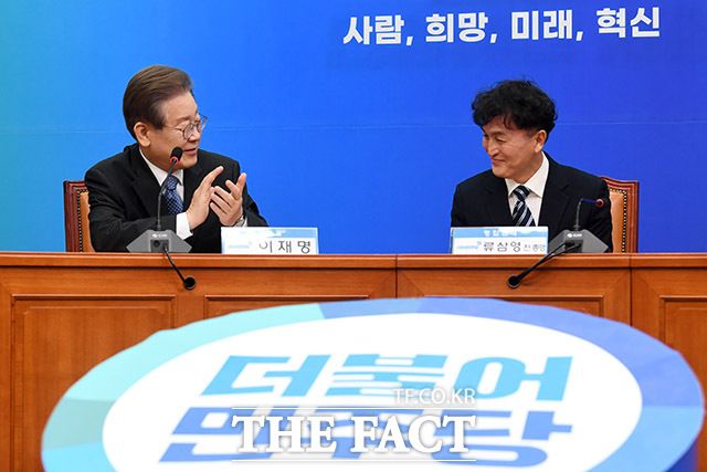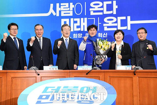 [더팩트ㅣ국회=남용희 기자] 이재명 더불어민주당 대표와 인재영입 3호 인사인 류삼영 전 총경과 서영교 최고위원이 18일 오전 서울 여의도 국회에서 열린 더불어민주당 3차 인재영입식에서 기념촬영을 하고 있다.