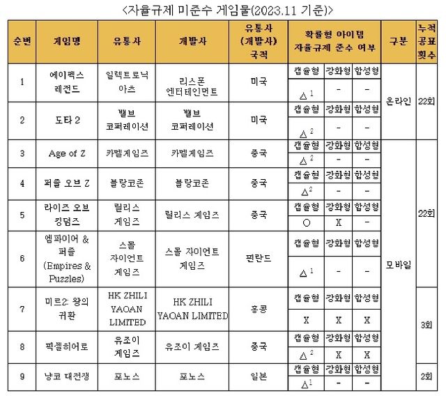 이에 따라 GSOK 내 자율규제평가위원회는 2023년 11월 기준으로 총 9종(온라인 2종, 모바일 7종)의 자율규제 미준수 게임물을 공개했다.