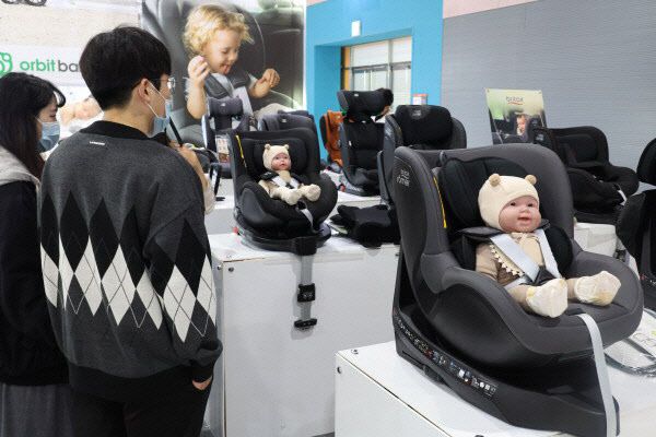 10일 서울 강남구 세텍에서 열린 서울베이비키즈맘페어에서 예비 부모가 베이비 카시트를 살펴보고 있다.(사진=연합뉴스)
