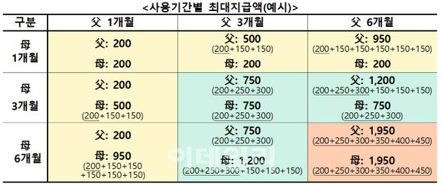 200만원(1개월)→250만원(2개월)→300만원(3개월)→350만원(4개월)→400만원(5개월)→450만원(6개월)으로, 부모가 모두 6개월간 육아휴직을 사용한다면 부부 합산 최대 3900만원을 받을 수 있다. 고용부는 이를 통해 여전히 여성이 70%을 차지하는 육아휴직 사용에 남성의 참여가 증가할 것으로 기대하고 있다.