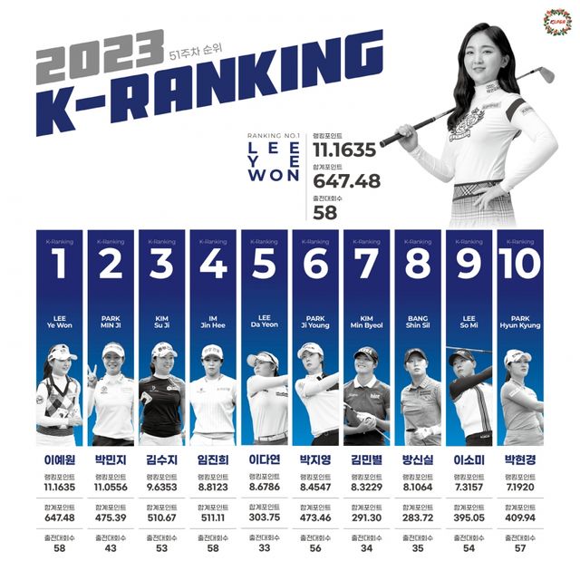 K랭킹은 104주(2년)간의 성적을 반영하되 최근 13주 성적에 더 큰 비중을 두고 있어 2023시즌 하반기까지 꾸준한 활약을 펼친 이예원이 지금까지도 많은 포인트를 획득하고 있으며 격차를 더 벌릴 수 있는 상황이다.