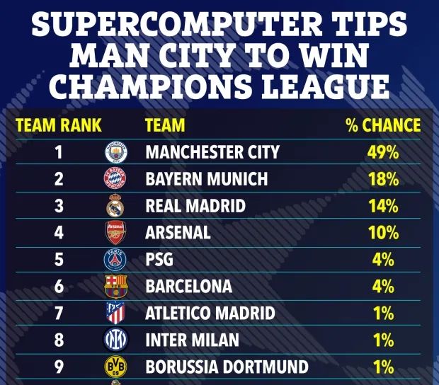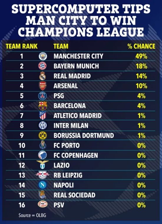 언론은 영국의 스포츠 베팅 사이트 '온라인 베팅 가이드(OLBG)'의 슈퍼컴퓨터 예측을 전하며 16강 진출 팀 중 맨시티가 가장 높은 49%의 우승 확률이 있다고 밝혔다.