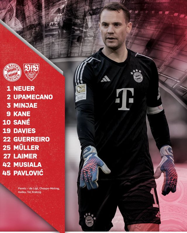 뮌헨은 4-2-3-1 전형으로 나섰다. 마누엘 노이어 골키퍼를 비롯해 코나트 라이머, 다요 우파메카노, 김민재, 알폰소 데이비스가 수비를 구축했다. 중원은 알렉산다르 파블로비치와 하파엘 게레이루가 맡았다. 2선엔 르로이 사네, 토마스 뮐러, 자말 무시알라, 최전방에 해리 케인이 출전했다.
