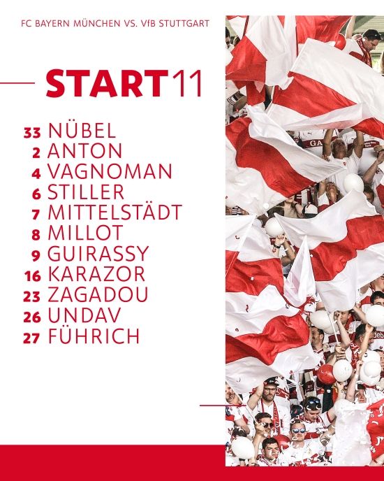 이에 맞서는 슈투트가르트는 4-2-2-2 전형으로 나왔다. 알렉산더 뉘벨 골키퍼를 비롯해 막시밀리안, 미텔슈타트, 단-악셀 자가두, 발데마르 안톤, 요슈아 바그노만이 수비를 구성했다. 3선에 아타칸 카라조르, 안젤로 스틸러가 수비를 보호했다. 2선엔 크리스 퓌리히, 엔조 밀로, 최전방에 기라시와 데니즈 운다브가 나와 득점을 노렸다.