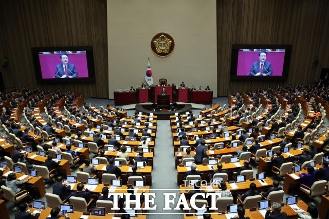 윤석열 대통령이 19일 주재한 국무회의에서 국회를 향해 산업은행법과 우주항공청법 등 민생 법안의 통과를 당부했다. 사진은 지난 10월 31일 국회 본회의장에서 내년도 예산안에 대한 시정연설을 하는 윤 대통령. /이새롬 기자
