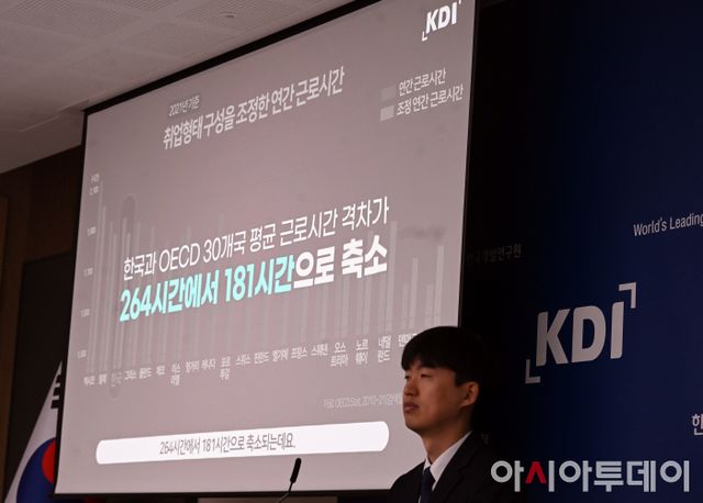 아시아투데이(세종) 박성일 기자 = 김민섭 KDI 재정·사회정책연구부 연구위원이 19일 오전 세종시 정부세종청사 중앙동 브리핑룸에서 'OECD 연간 근로시간의 국가 간 비교분석과 시사점' 대한 브리핑에 앞서 모니터 브리핑을 하고 있다.