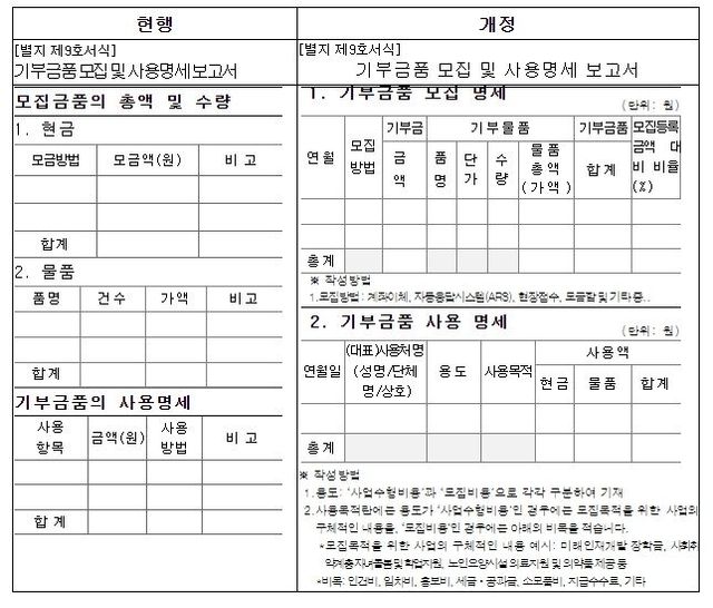 개정안을 통해 모집 단체들의 기부금품 모집 및 사용에 대하여 ‘연월일, 사용처명, 사업목적 등’을 기재하도록 관련 서식을 개정*한다.