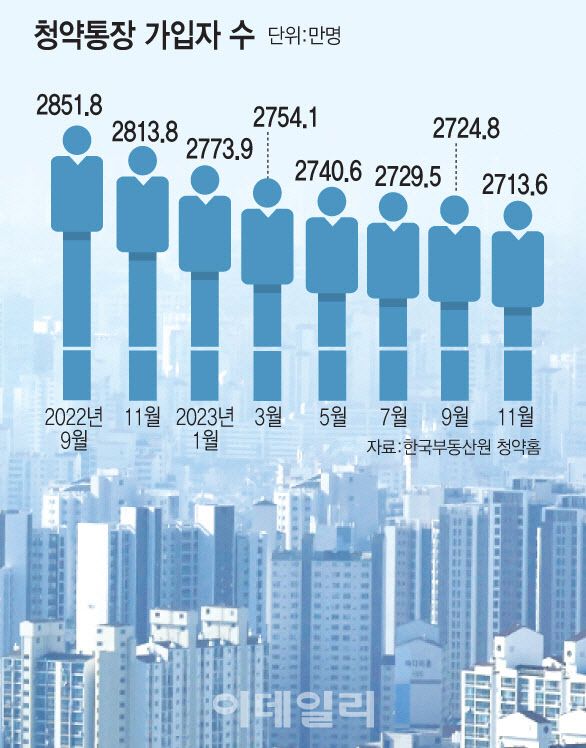 실제 청약통장을 해지하는 사람들이 늘어나고 있다. 한국부동산원 청약홈에 따르면 11월 기준 청약통장 총 가입자 수는 2713만 6195명으로 올 초 대비 60만명 가까이 줄었다. 지난해 6월 2859만 9279명이었던 청약통장 총 가입자 수는 17개월 연속 감소세를 이어가고 있다.