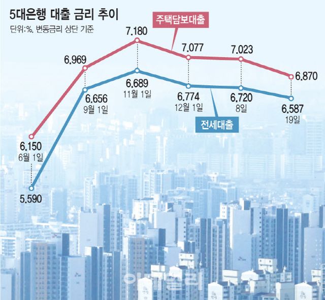 19일 금융권에 따르면 KB국민·신한·하나·우리·NH농협은행 등 국내 5대 은행의 주택담보대출 변동 금리(신규 코픽스 6개월)는 이날 기준 연 4.52~6.87%로 집계됐다. 미국이 통화정책을 완화할 수 있다는 시그널을 내비치면서 우리나라의 시장금리도 최근 서서히 하락하고 있으나 금리 하단은 올 6월 중순 이후 반년 동안 4%대를 벗어나지 못하고 있다. 차주들이 체감하기엔 여전히 고금리 기조가 이어지고 있는 것이다.