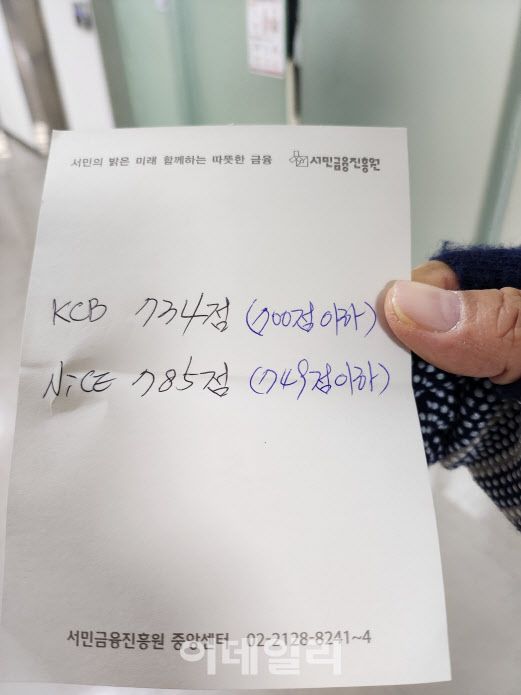19일 서울 중구 중앙서민금융통합지원센터에서 만난 70대 A씨가 보여준 메모지. 소액생계비대출을 받기 위해서는 신용점수(KCB 700점·NICE 749점)가 일정 점수 이하여야 한다. 하지만 무소득자인 A씨는 이보다 높아 소액생계비대출을 받을 수 없었다.(사진=송주오 기자)
