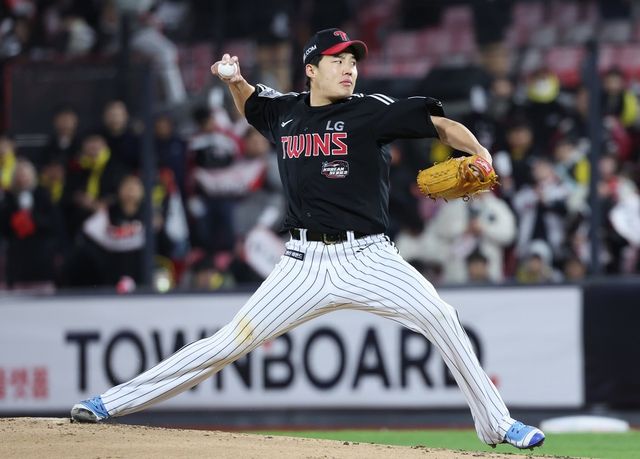 임찬규가 지난달 10일 오후 경기도 수원시 장안구 수원KT위즈파크에서 열린 '2023 신한은행 SOL KBO 포스트시즌' 한국시리즈 3차전 kt 위즈와 LG 트윈스의 경기에서 역투하고 있다. / 뉴스1