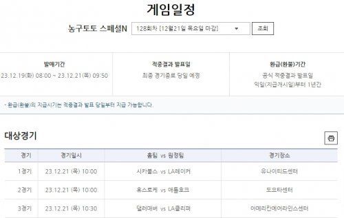 국민체육진흥공단에서 발행하는 체육진흥투표권 스포츠토토의 수탁사업자 스포츠토토코리아가 2023~2024시즌 미국프로농구(NBA) 3경기를 대상으로 한 농구토토 스페셜N 128회차를 발매한다.