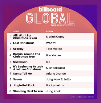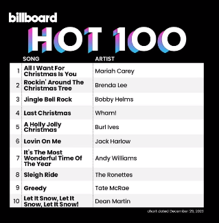 머라이어 캐리의 캐럴 '올 아이 원트 포 크리스마스 이즈 유'가 빌보드 1위를 다시 차지함으로써 그녀는 '크리스마스 여왕'의 자리를 굳건히 지키고 있습니다.