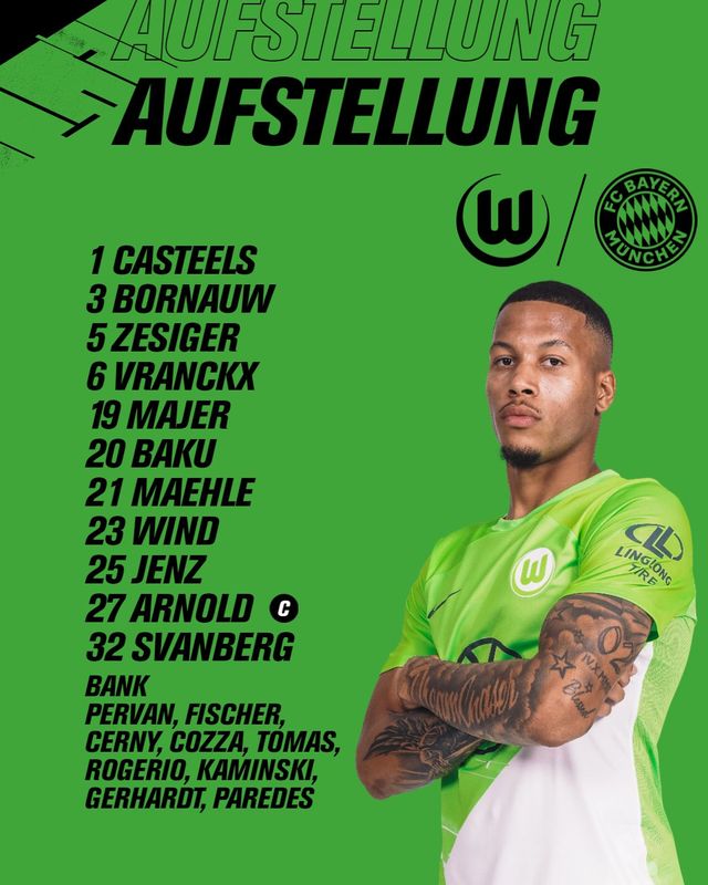홈 팀 볼프스부르크는 3-3-2-2 전형으로 나섰다. 쾬 카스틸스 골키퍼를 비롯해 세드릭 자시거, 모리츠 옌스, 세바스티안 보르노우가 백3를 구축했다. 아스터 브랑크스가 수비를 보호하고 윙백에 요아킴 멜레, 리들 바쿠가 나섰다. 2선 공격에 막시밀리안 아놀드, 마티아스 스반베리, 최전방에 로브로 마예르, 요나스 윈드가 출격했다.