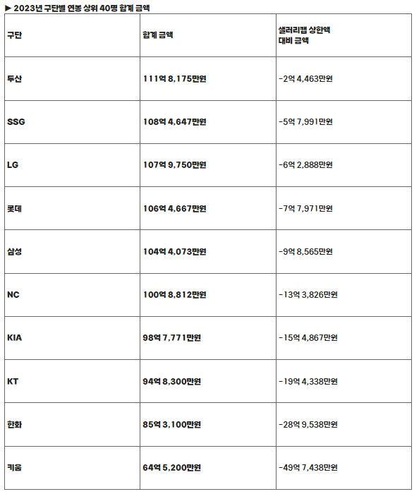 2023년 구단별 연봉 산출 결과 샐러리캡 상한액을 초과한 구단은 없었다.