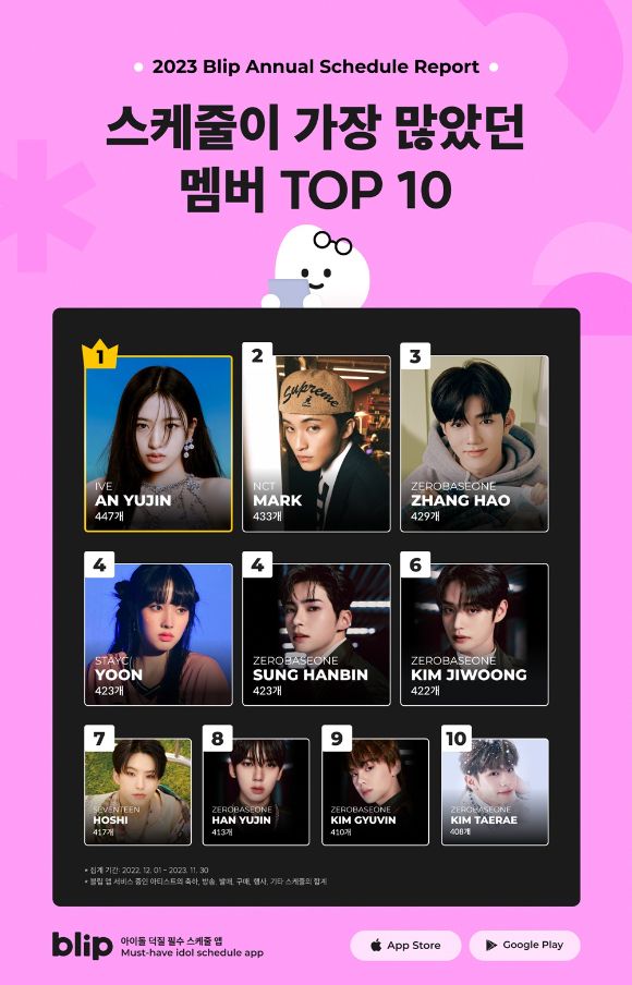 올해 가장 스케줄이 많았던 아이돌 멤버는 아이브 안유진으로, 무려 447건의 스케줄을 소화한 것으로 확인됐다. 아이브 앨범 활동과 더불어 예능, 광고 등 개인 활동으로도 활약한 결과다.