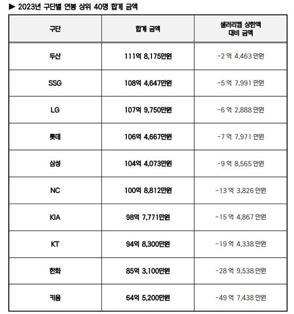 ◇2023년 구단별 연봉 상위 40명 합계 금액