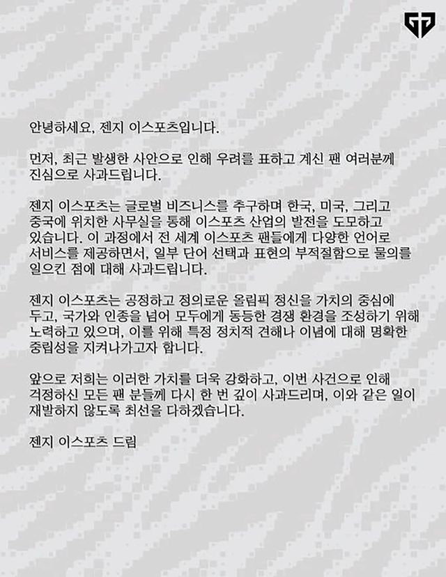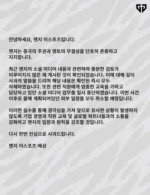 앞서 지난 20일 젠지는 공식 SNS를 통해 "중국의 주권과 영토의 무결성을 단호히 존중하고 지지 한다"라고 밝혔다.