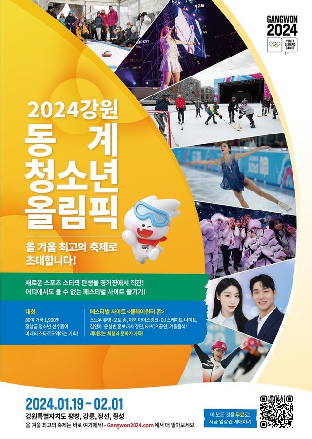 한편 2024 강원 동계청소년올림픽대회는 아시아에서 처음으로 개최되는 동계청소년올림픽으로, 총 7개 경기, 15개 종목에 80여개국 1900명의 선수가 참가한다. 개회식을 제외한 모든 경기는 무료 관람이지만 조기 매진이 예상되는 종목들은 사전 예매하는 것이 좋다. 또한 대회 입장권 소지자는 플레이윈터존의 모든 프로그램에 무료로 참여 가능하지만 일부 행사는 사전 예약이 필요하다. 자세한 내용과 일정은 대회 공식 홈페이지 및 소셜 미디어(SNS)를 통해 확인 가능하다.