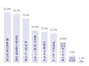 2024년 한국경제가 주의해야 할 대내외 리스크에 대한 지적도 나왔다. 먼저 대외리스크로는 ‘미국 통화긴축 장기화’(37.8%)가 가장 많이 우려됐고 ‘글로벌 수출경쟁 심화’(36.7%), ‘중국의 저성장’(33.3%) 등 수출무역 저하를 우려하는 목소리가 뒤따랐다.