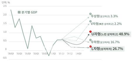 내년 우리 경제의 경기추세에 대한 전망을 묻는 질문에 대해 전문가들은 빠른 회복을 기대하기 어렵다고 의견을 모았다. 전문가의 48.9%가 ‘U자형의 느린 상저하고(上低下高)’를 보일 것이라고 응답했고, 26.7%는 ‘L자형의 상저하저(上低下低)’를 전망했다. 한국경제의 본격적인 경기회복 시점에 대해서는 ‘2024년 하반기’(31.1%)나 ‘2025년 상반기’(26.7%)를 꼽은 응답이 많았다.