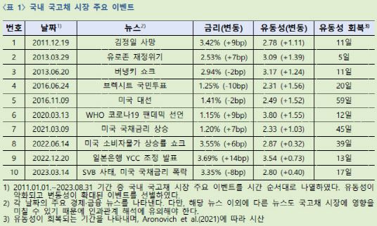 이벤트 분석 결과, 시장 유동성 악화는 대체로 변동성 확대와 함께 발생했다. 국고채 시장과 관련된 예상치 못한 뉴스가 보도될 경우 시장 유동성 악화가 변동성 확대를 선행하는 모습을 보였다. 또한 시장 유동성이 크게 악화될 경우 더디게 회복되는 모습이 자주 관찰됐고, 이 경우 대체로 평상시보다 높은 변동성을 보였다.