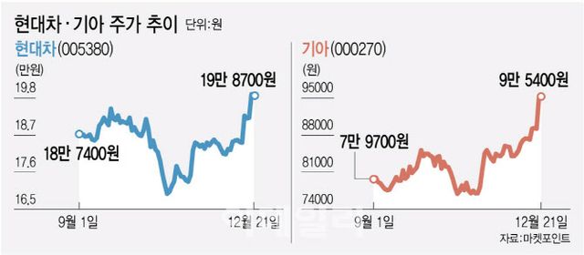 21일 마켓포인트에 따르면 이날 현대차(005380)는 19만8700원에 거래를 마쳤다. 이는 지난달(11월21일) 18만4200원 대비 7.9%(1만4500원) 상승한 수준이다. 기아(000270)는 이날 9만5400원으로 장을 마쳤다. 전월 8만3600원 대비 14.1%(1만1800원) 올랐다.