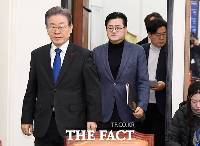 이재명 더불어민주당 대표(왼쪽)와 홍익표 원내대표가 22일 오전 서울 여의도 국회에서 열린 더불어민주당 최고위원회의에 참석했다. 회의실 들어서는 이 대표(왼쪽)와 홍 원내대표. /배정한 기자