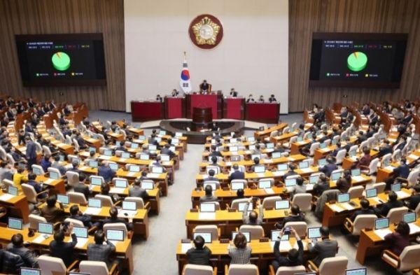 | 21일 서울 여의도 국회에서 열린 제411회국회(임시회)제2차본회의에서 2024년도 예산안이 통과되고 있다. [국회사무처 제공] |