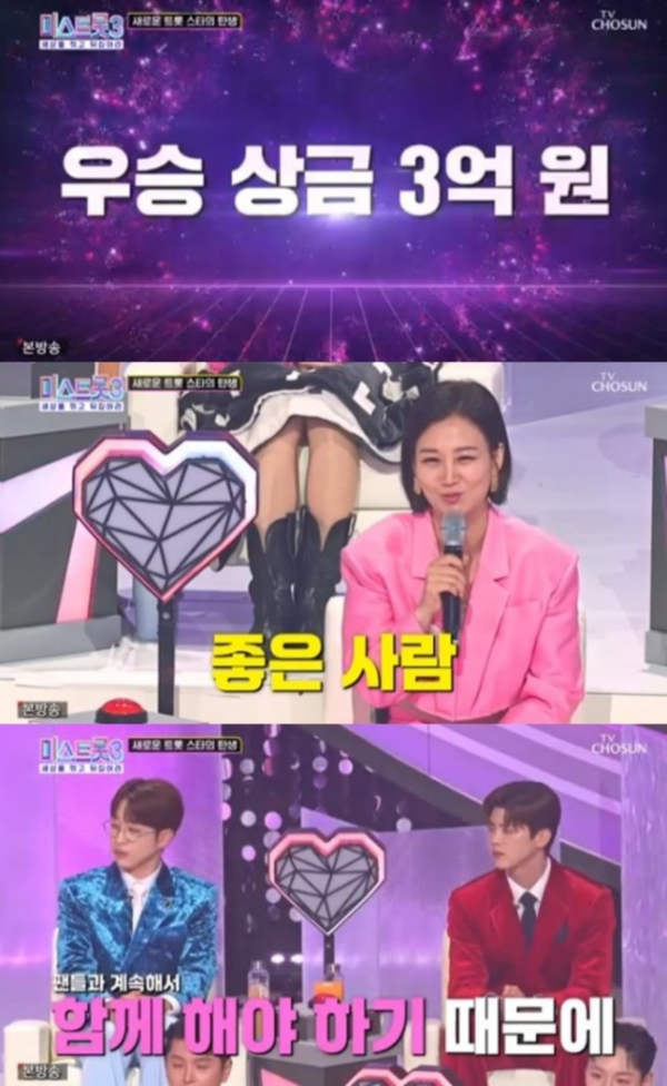 이어 김성주는 "'미스트롯3' 우승 특전을 소개한다. 우승 상금은 총 3억 원과 함께 각종 특전이 주어진다"며 "새 시즌을 맞아 잔인하게 돌아왔다. 새롭게 바뀐 룰을 소개한다. 1라운드는 1대 1 배틀 이다. 총 72명의 참가자들이 여덟 개 부서로 나눠진다. 하트 수가 더 많은 한 명만 다음 라운드에 진출한다"고 설명해 긴장감을 높였다.