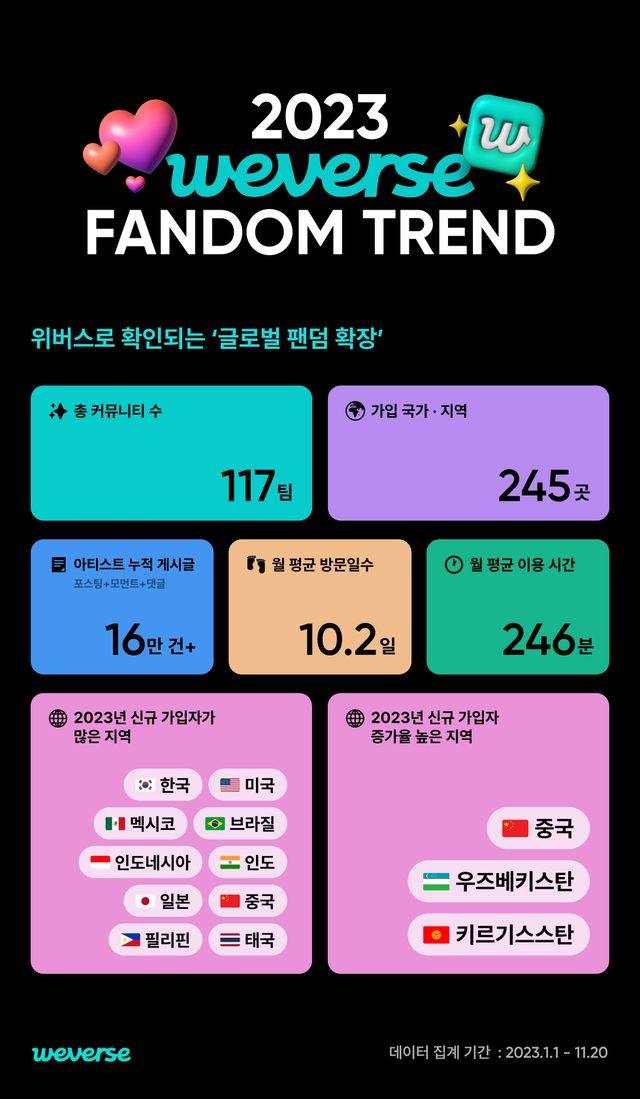 12월 현재 위버스 가입자는 245개 국가 및 지역에 분포해 있고, 90% 이상이 해외 유저다. 올들어 신규 가입자가 가장 많이 늘어난 나라는 중국⠐한국⠐필리핀⠐브라질⠐인도로 나타났다. 아울러 중국과 우즈베키스탄, 키르기스스탄 등 중앙아시아 지역의 신규가입자 증가율이 가장 높았다. K-팝 팬덤이 지구촌 전역에 확산된다는 의미다.