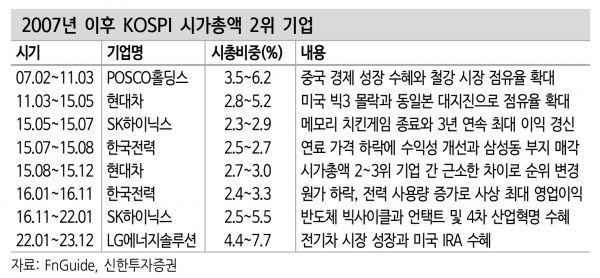 SK하이닉스가 2년 만에 KOSPI 시가총액 2위를 탈환했다. 삼성전자가 20년 넘게 1위를 자리를 지키는 와중에 2위 자리싸움은 4~5년 간격 또는 그보다 짧게 일어났다. 1위 종목은 한국 주식시장의 얼굴뿐만 아니라 경제에 있어 주력 산업을 의미한다. 주식시장에서는 2위의 변화가 더욱 중요한데 이는 시장의 색깔을 변화시키는 주도 업종을 의미한다.