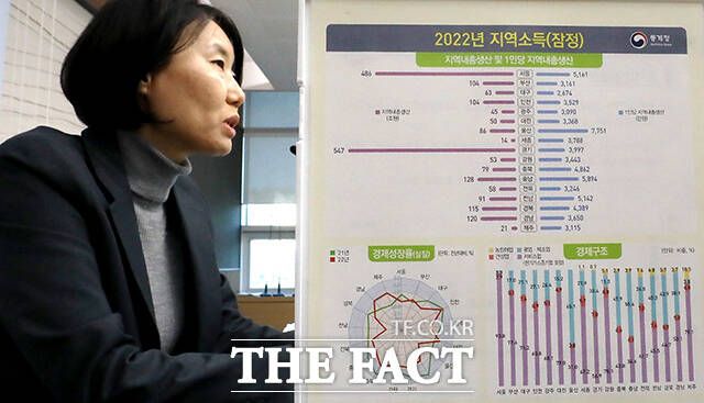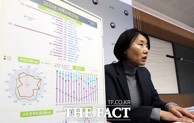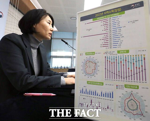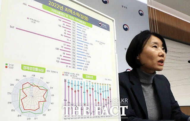[더팩트ㅣ세종=이동률 기자] 정선경 통계청 소득통계과장이 22일 오전 세종시 정부세종청사에서 2022년 지역소득 잠정 결과를 발표하고 있다.