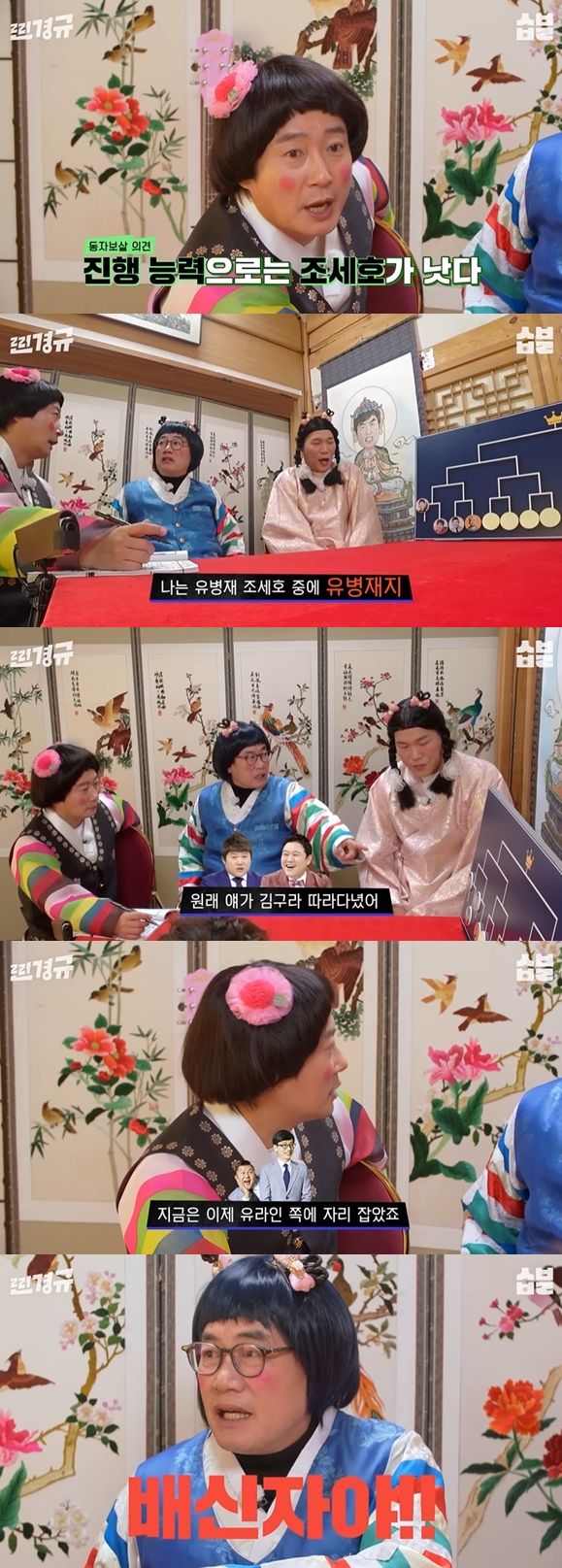 이수근이 "이제 유라인 쪽에 자리 잡았죠"라고 덧붙이자, 이경규는 "배신자야"라고 해 출연진들을 폭소케 했다.