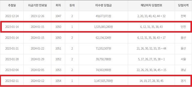 동행복권이 19일 기준 공개한 '만기도래 2개월 이내 고액(1,2등) 미수령 당첨금 현황'에 앞서 올라온 1050회차 로또 1등 미수령 당첨자도 감감무소식이다.
