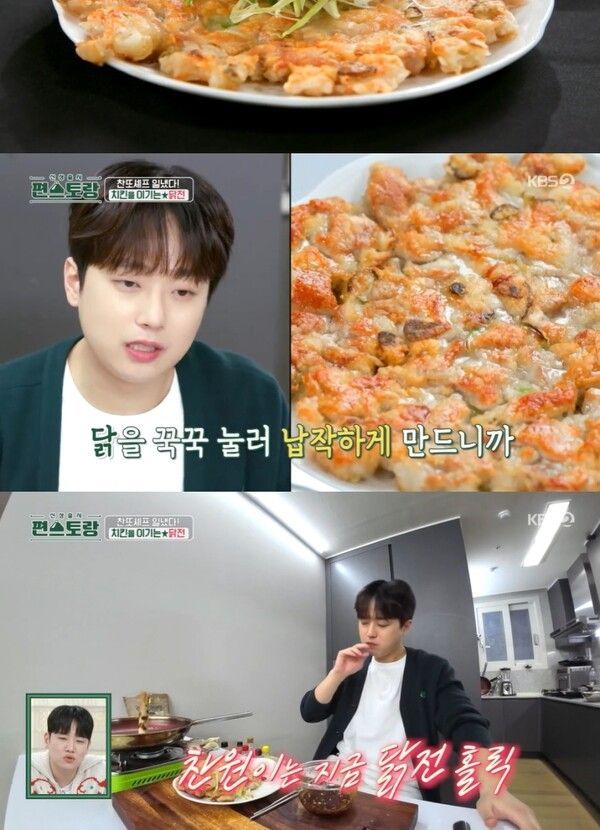 특히 화제를 모은 것은 이찬원의 닭전 레시피였다. 평소 야구를 좋아하는 이찬원은 야구장의 시그니처 메뉴인 치킨보다 더 맛있는 닭 요리를 선보였다. 닭다리살을 이용해 겉은 바삭하고 속은 촉촉하며 쫀득쫀득한 닭전을 만든 것. 신박한 레시피의 등장에 모두들 깜짝 놀란 가운데 이찬원은 닭전의 풍미를 업그레이드시켜 줄 특제 마늘간장소스까지 뚝딱 완성했다.