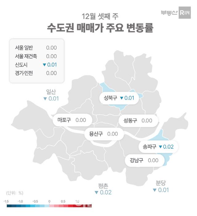 23일 부동산R114에 따르면 12월 셋째주 수도권 지역 중 전주 대비 아파트 매매가격이 상승한 지역은 한 곳도 없다. 서울 또한 전체 25개구 중 23곳이 보합(0.00%)을 나타냈고, 나머지 2곳도 -0.01~-0.02% 수준의 약보합을 기록하며 3주 연속 가격이 동결됐다.