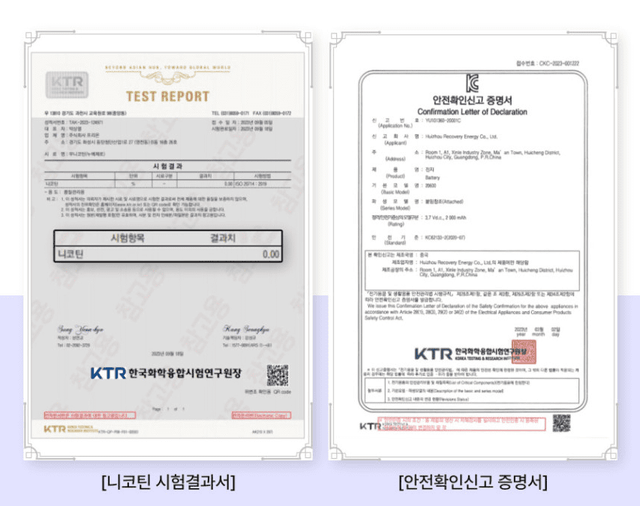 실제 시험결과, 니코틴 검출 0%를 자랑했으며, 안전확인신고까지 완료해 안심하고 사용할 수 있다.