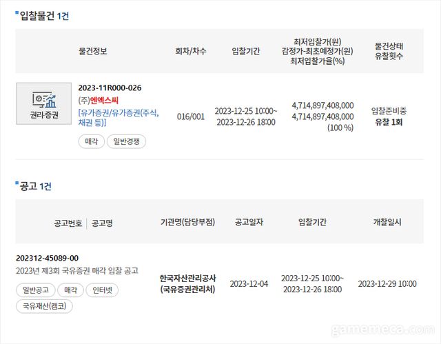 ▲ NXC 지분 입찰 현황 (자료출처: 온비드 공식 홈페이지)
