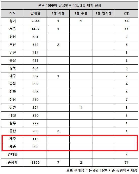동행복권이 23일 추첨한 로또 1099회 당첨번호 조회 결과 1등은 9명, 2등은 71게임이다. 전국 17개 시도 중 제주, 세종 지역에서는 로또 고액(1,2등) 당첨 판매점이 단 한 곳도 나오지 않았다.