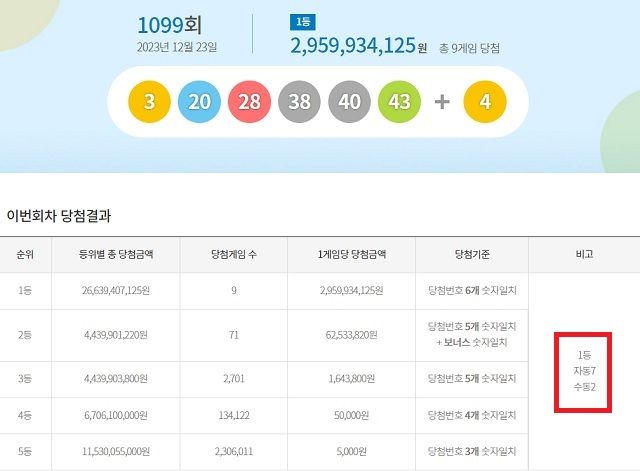 1099회 로또 1등 9명 23일 동행복권 추첨 결과에 따르면 1099회 로또당첨번호 조회 1등 당첨자 9명 중 7명은 자동으로 구매했다. 나머지 2명은 수동으로 샀다. /동행복권 캡처