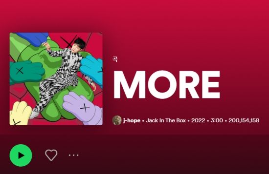스포티파이에 따르면 22일, 방탄소년단(BTS) 제이홉의 솔로곡 '모어'(More)가 2억 스트리밍을 돌파했다.