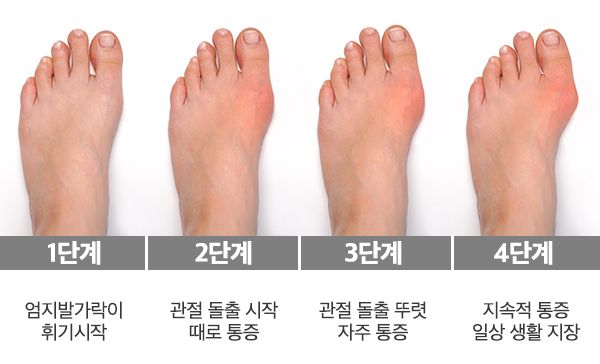 무지외반증 1단계는 엄지발가락이 바깥쪽으로 약간 휘어진 상태, 2단계는 엄지발가락이 바깥쪽으로 휘기 시작하며 발가락과 발등 사이 돌출이 생긴다. 3단계, 4단계는 말기 단계에 속한다.