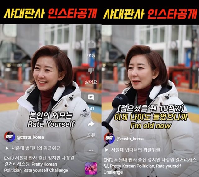 유튜브 채널 '캐스트유'에는 23일 'ENFJ 서울대 판사 출신 정치인 나경원 길거리 캐스팅'이란 제목의 숏폼 영상이 올라왔다. 해당 영상에서 나경원은 자신의 외모를 10점 만점에 8점이라 평가했다.