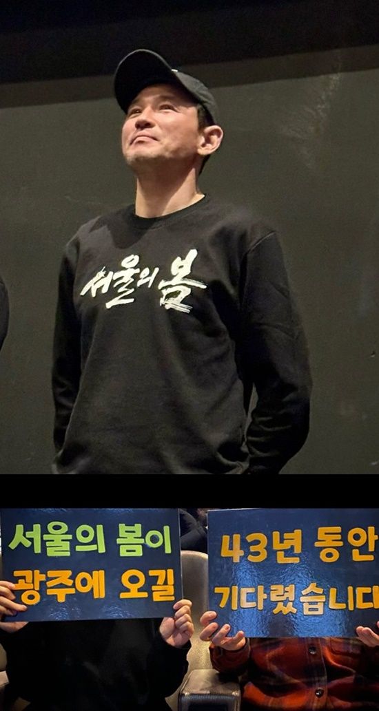 이에 관객들은 '서울의 봄이 광주에 오길 43년 동안 기다렸습니다'라는 내용의 플래카드를 들고 '서울의 봄' 팀을 응원하는 모습이 포착됐다.