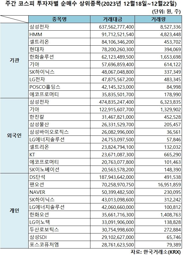 기관 '삼성전자'·외인 '삼성전자'·개인 'DS단석' 1위 [주간 코스피 순매수- 12월18일~12월22일]