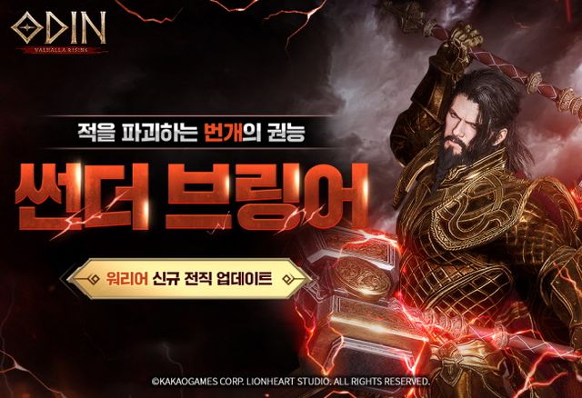 카카오게임즈가 서비스라고, 라이온하트 스튜디오가 개발하는 '오딘: 발할라 라이징'이 신규 전직 클래스 '썬더 브링어'를 업데이트해 주목을 받으며, 구글플레이 매출 정상을 탈환했다.