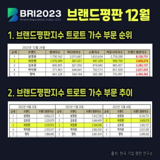한국기업평판연구소가 2023년 11월 24일부터 12월 24일까지 트로트 가수 브랜드 빅데이터를 분석한 결과, 이찬원은 12월 브랜드평판지수 3,608,078을 기록했다. 이는 트로트가수 2위에 해당하는 수치다.