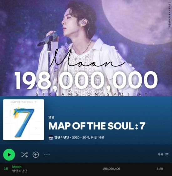 방탄소년단(BTS) 진의 솔로곡 'Moon(문)'은 지난 24일 세계 최대 음원 플랫폼 스포티파이(Spotify)에서 1억 9,800만 스트리밍을 돌파했다.