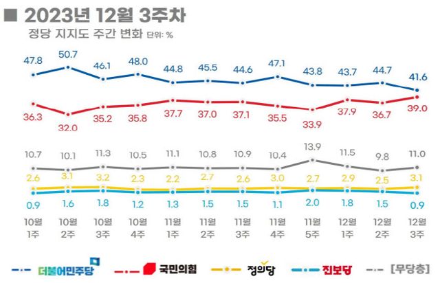 정의당 3.1%, 진보당 0.9% 등이 그 뒤를 이었다. 무당층 응답률은 11.0%로 전주보다 1.2%포인트 상승했다.